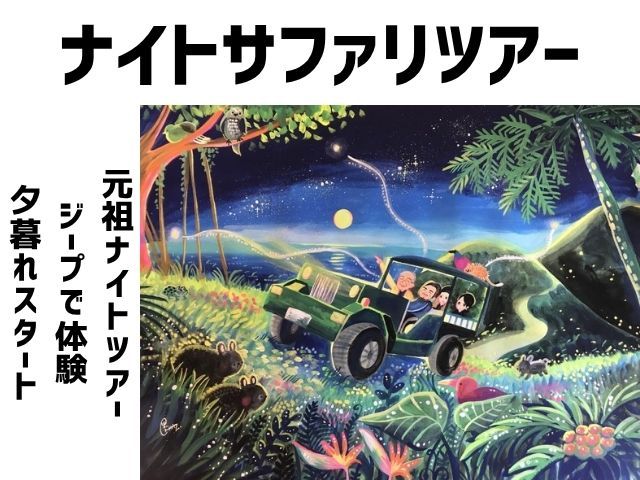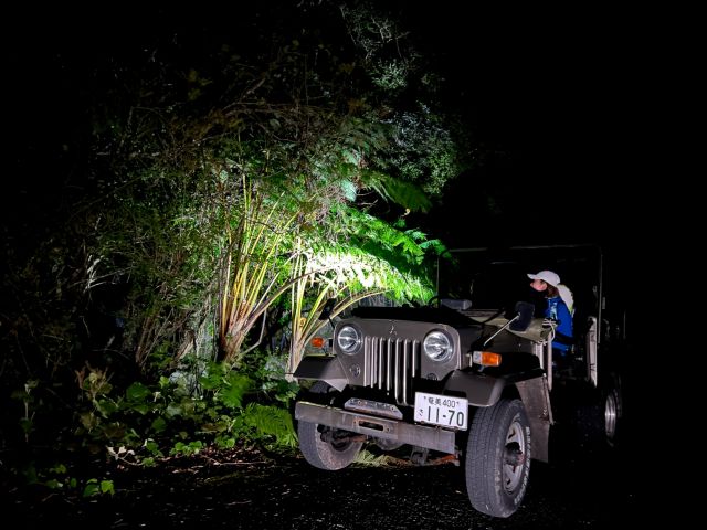 ナイトサファリツアー専門店のガイドが運転する4WDジープでアマミノクロウサギなどの動植物を探しに行こう!車両1台のゲスト定員は大人5名様まで。少人数でご案内いたします。日没に合わせてツアースタート!