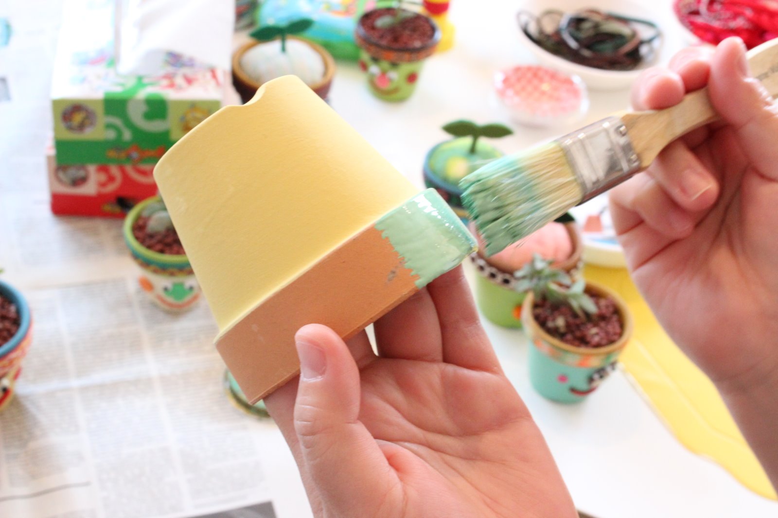 ペンキを塗ってカラフルな鉢植えを作っていきます。