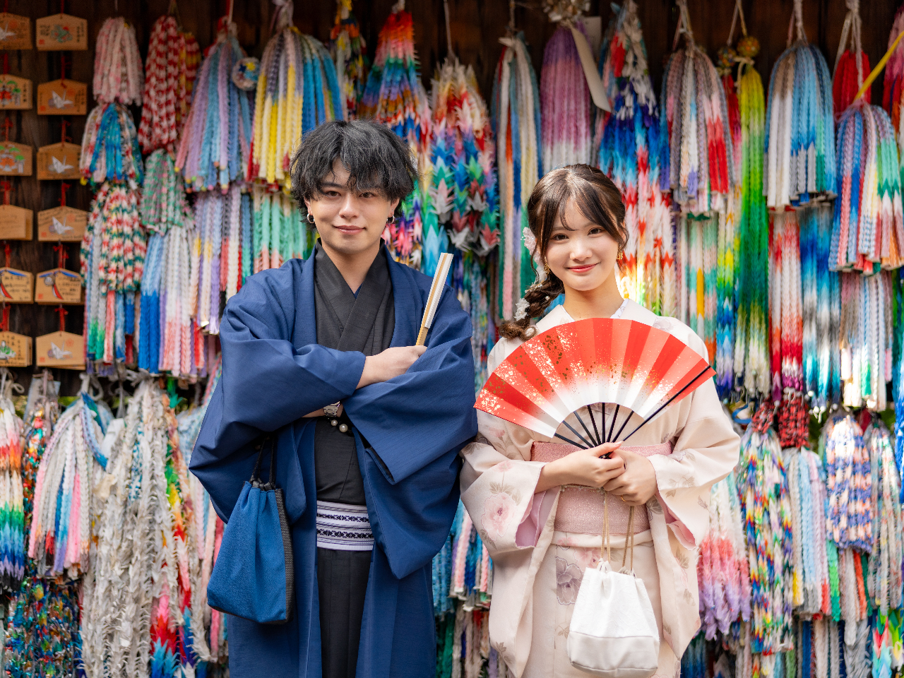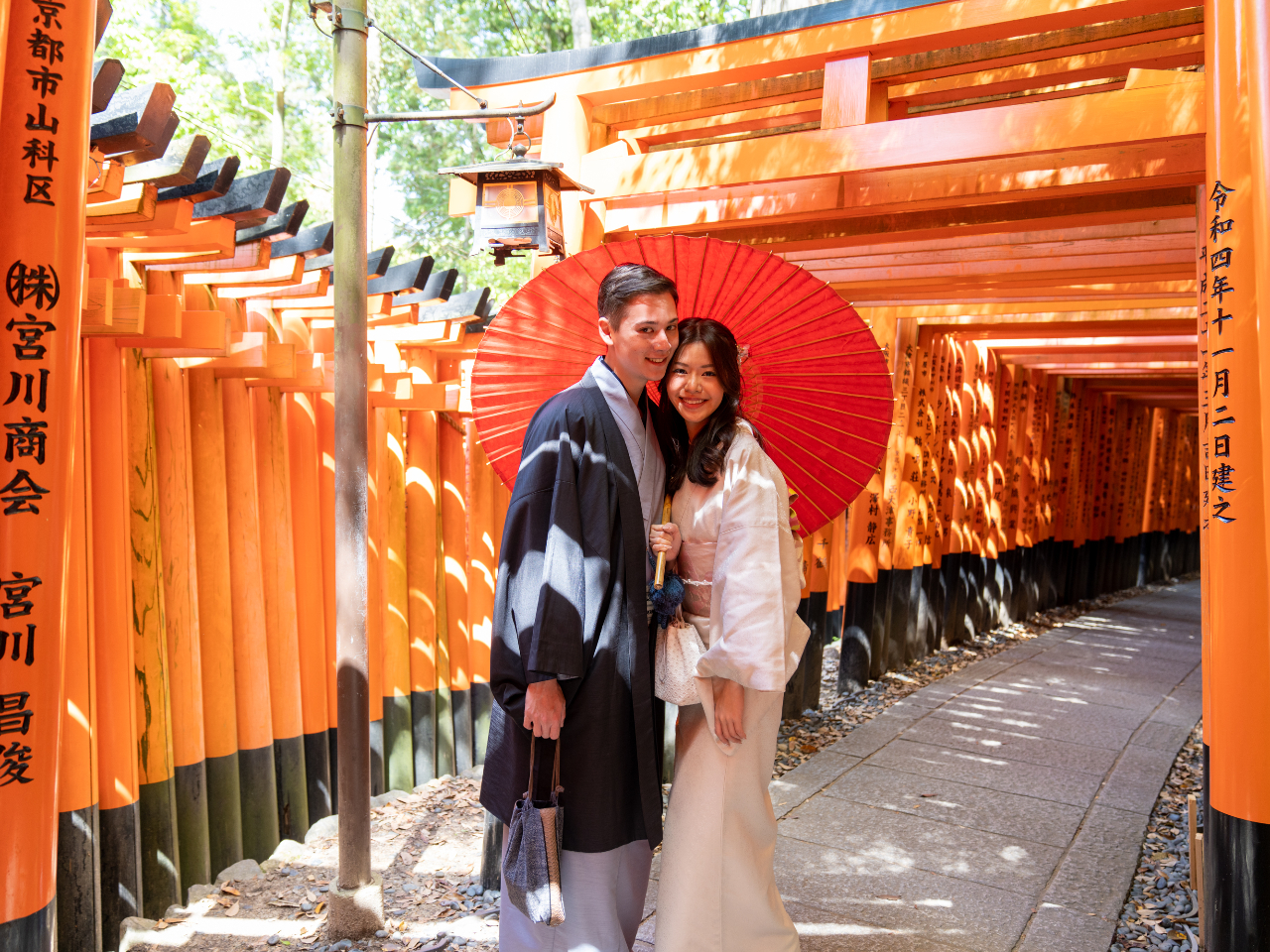 【カップルプラン】伏見稲荷で着物レンタル(ヘアセット&髪飾り込み!)