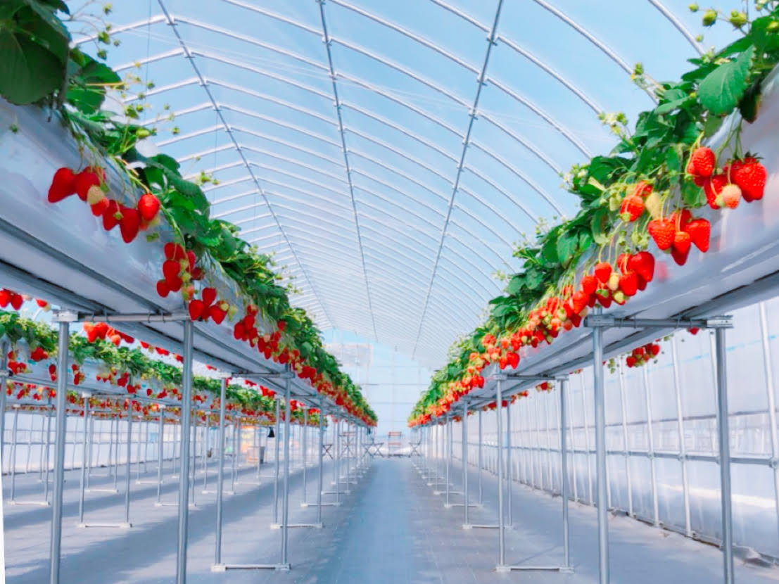 滋賀県が開発した少量土壌培地耕と呼ばれる養液栽培技術を用い、4棟のハウスで約1万株の「章姫」や「紅ほっぺ」を育てています。