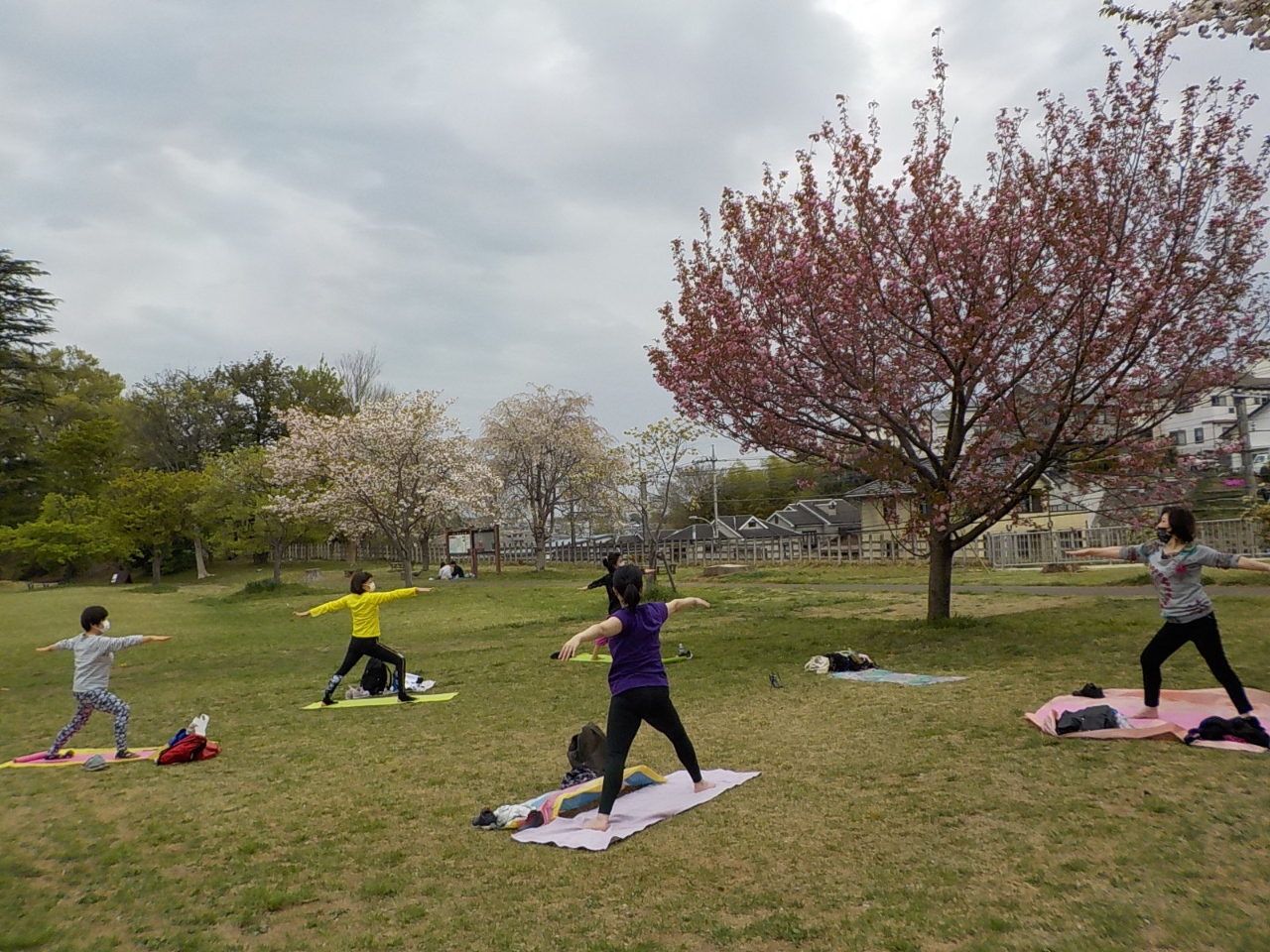 桜がたくさん咲き乱れる広場で、のんびりヨガを楽しみます。