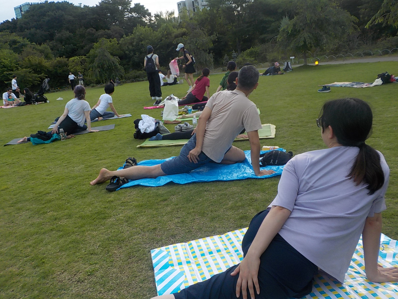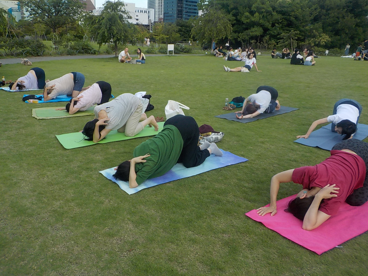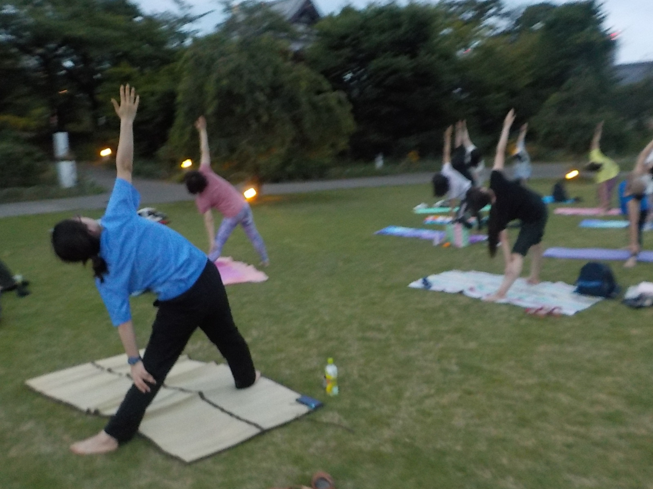 旧中川の芝生でサンセットと東京スカイツリーのイルミネーションを楽しみながら、ヨガをします。