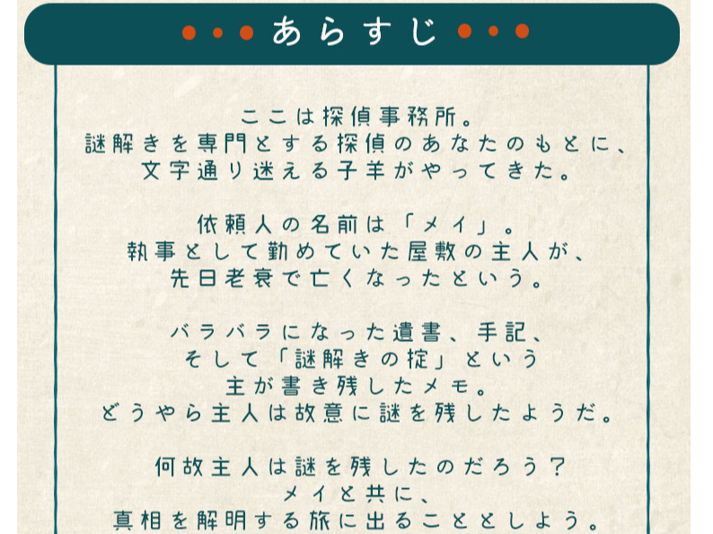 謎解きを専門とする探偵のあなたのもとに、文字通り迷える子羊がやってきた。