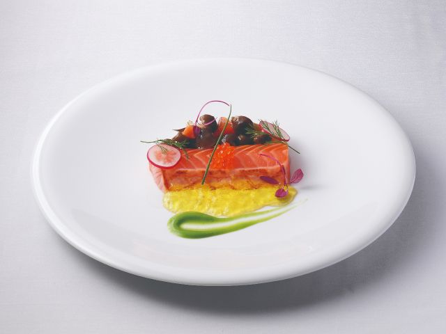 Aサーモンのマリネとキノコのサラダ 大葉風味のマスタードソース