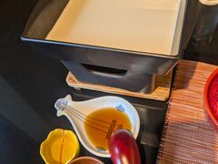 湯波懐石!いただきました。自分で湯波をすくって食べるのは初めて。濃厚でした。その後ににがりを入れておぼろ豆腐、こちらも美味!やはり出来立ては美味しい。湯波のキノコあんも優しい味。スイーツにチョコプリン。プラス!ソフトドリンクが選べました。その後は露天風呂。ぬるめのお湯でゆっくり長く湯船に浸かりました。食事は和室でゆっくりといただけました。予約して良かったです。