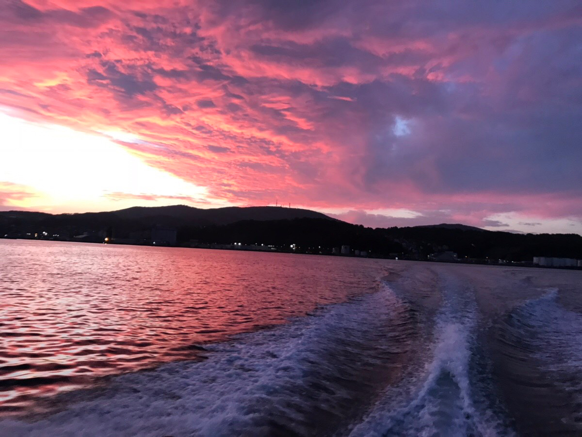 夕方便の醍醐味のサンセット風景!!季節により夕日の赤みが異なります!海から見るのもまた格別。写真は6月4週目の19:00頃。