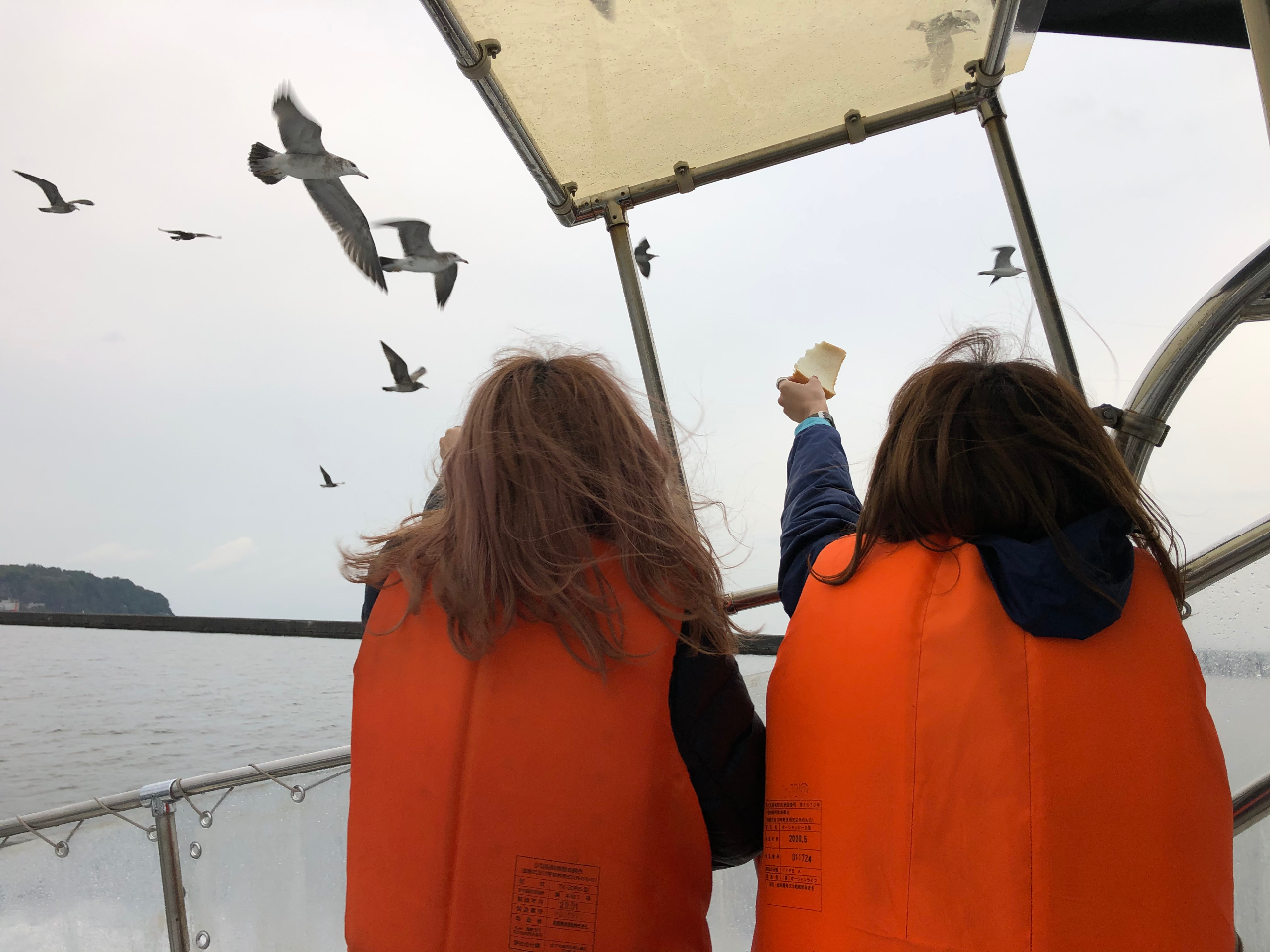大人気のカモメの餌やり!!船が止まっている時は目の前に来て餌をもらいに近距離接近することも。走行すると追いかけてくるので餌を差し出すと飛びながら食べにも来ます。