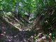 山道をしばらく進んでまず見えてくるのは、「弁慶の昼寝場所」と呼ばれるくぼ地と、「泣き石」と呼ばれる、大木に挟まった巨大な岩です。