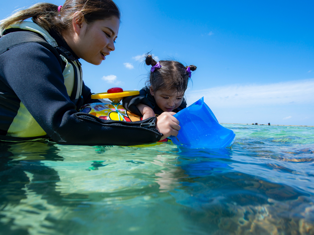 2歳からご参加いただけます。お子様のペースに合わせて進行し、器材の使い方も丁寧にご説明します。足が着く浅瀬での練習から始めるので安心です。水が苦手なお子様には、水中マスクの代わりに箱メガネで海の中をのぞくことも可能です。