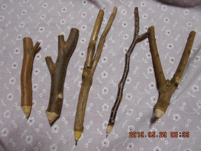 果樹園の自然の木の枝を使って、鉛筆や色鉛筆やボールペンを作ります。1時間で何本も作れます。