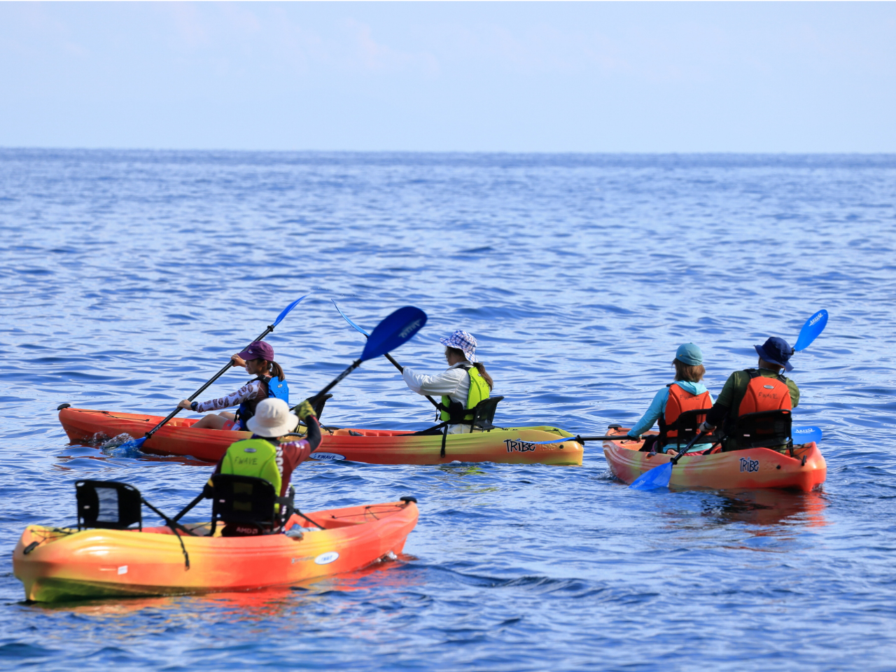 体験ダイビングを楽しんだ後は、ゆったりシーカヤック。レクチャーと練習の後、外海へ出発!少人数制だからお客様のペースに合わせて最適なコースをご案内。青い海に揺らめく海藻林が楽しめます!