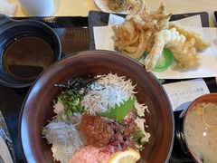 しらす食堂に行くべし!安い!しらす丼定食は最高!しらすと玉ねぎのかき揚げ、海老天、かぼちゃ天、甘い味噌汁!マグロ、しらす、生しらす、いくら、丼。じゃこの佃煮、漬物取り放題!