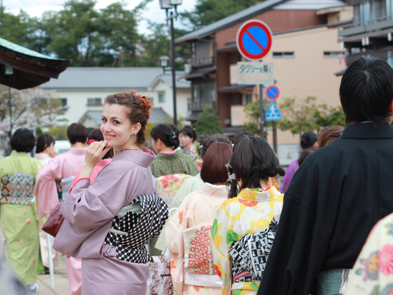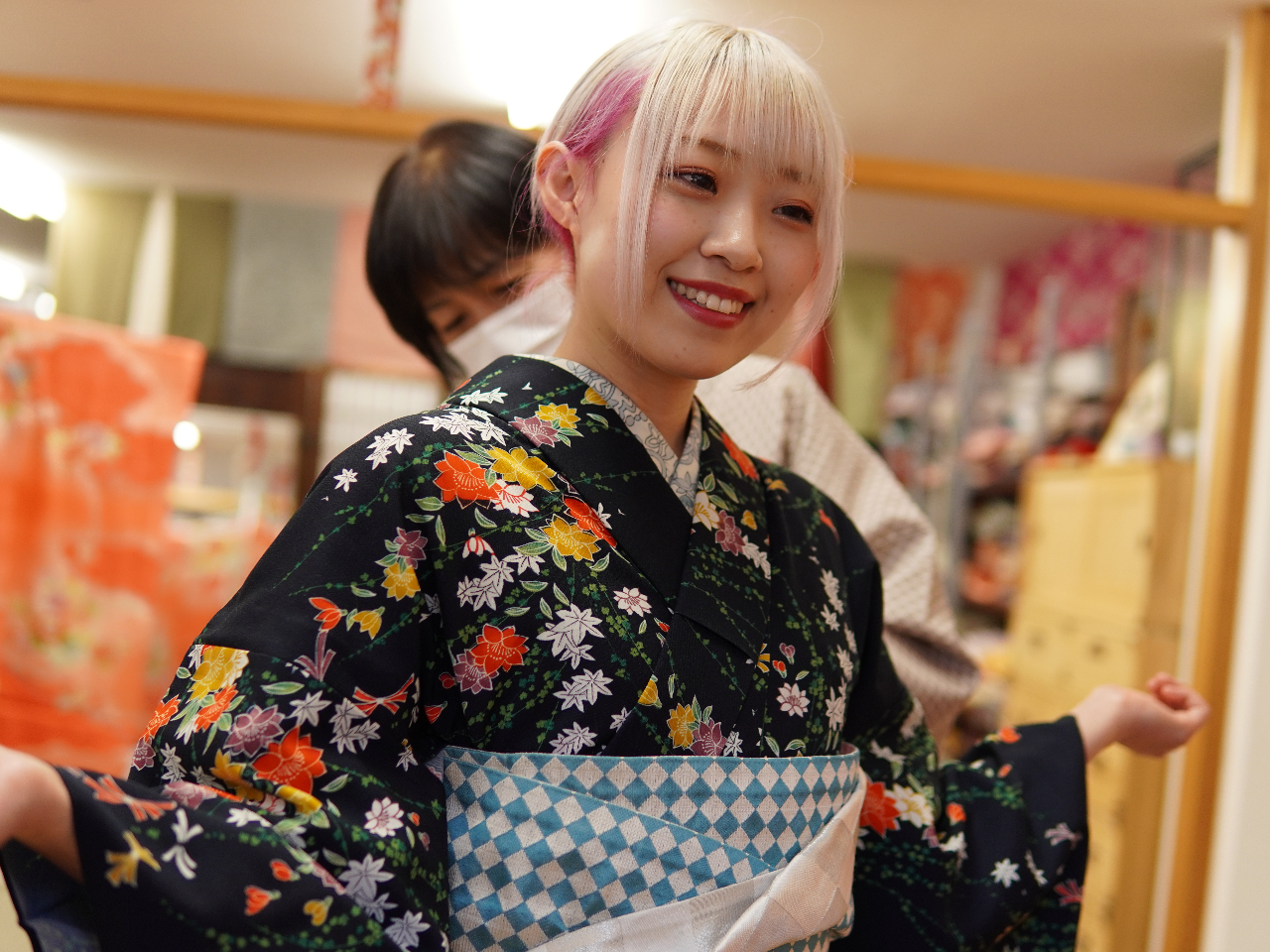 着物はおしゃれ小紋に半幅帯のプランとなります。