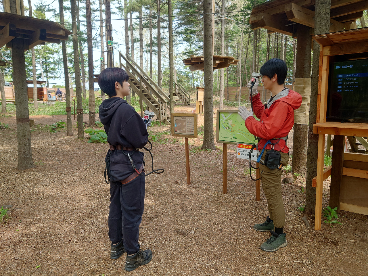 ハーネスを装着し、練習コースでインストラクターからのレクチャーがあります。ここで装備の使い方、注意点などを習得していただきます。セーフティブリーフィングは個人差もありますが、だいたい20〜30分程度です。