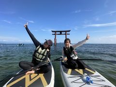 神社巡りが趣味で、このサップ体験を知り、サンセットの時間帯に参加しました。サップは初めてだったんですが、スタッフの方が丁寧に教えてくれて、いざ、白鬚神社の鳥居へ。琵琶湖なので波はないと思っていたのですが、琵琶湖は、日々変わるらしく、この日は波が高く漕ぐのが大変でしたが、着いたら感動。スタッフの方が、写真も沢山撮ってくれて、本当に良い経験が出来ました。