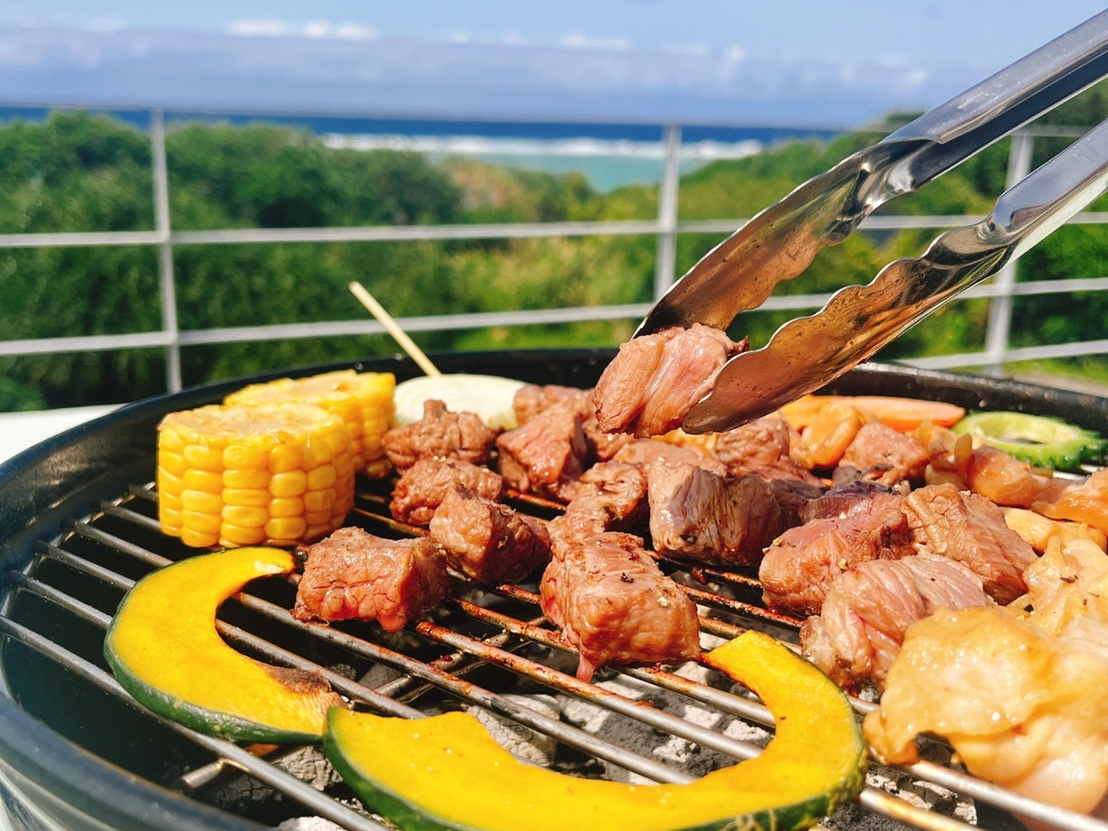 手ぶらで気軽にBBQ♪料理長こだわりの肉厚ステーキ肉でのBBQを、恩納ブルーを眼下に潮風を感じながらお楽しみいただきます。BBQ食材は、料理長が拘った【牛ステーキ肉250g・鶏肉100g・ウインナー2本・季節のお野菜5種・ライス】