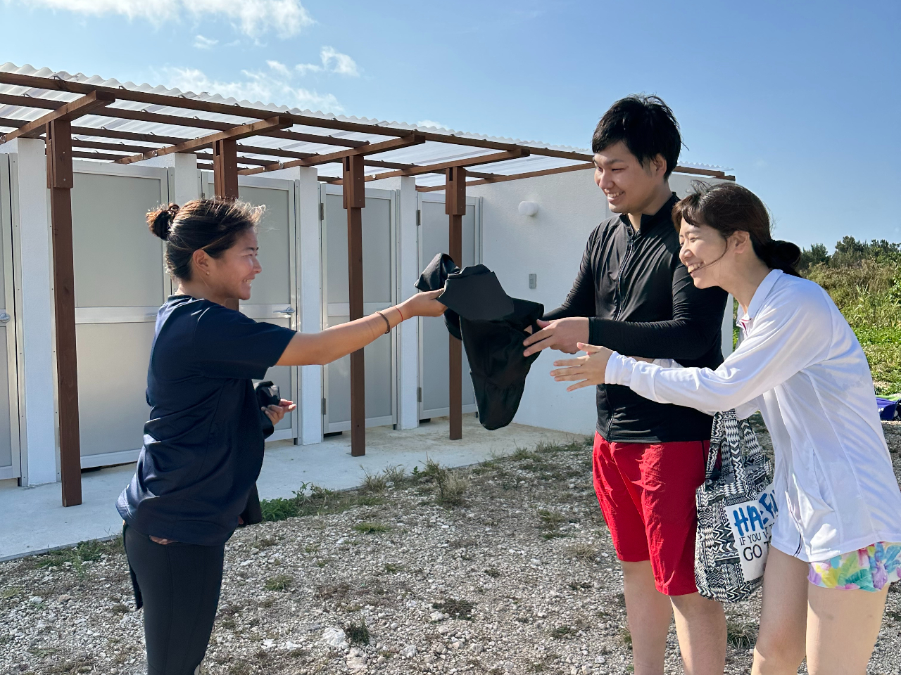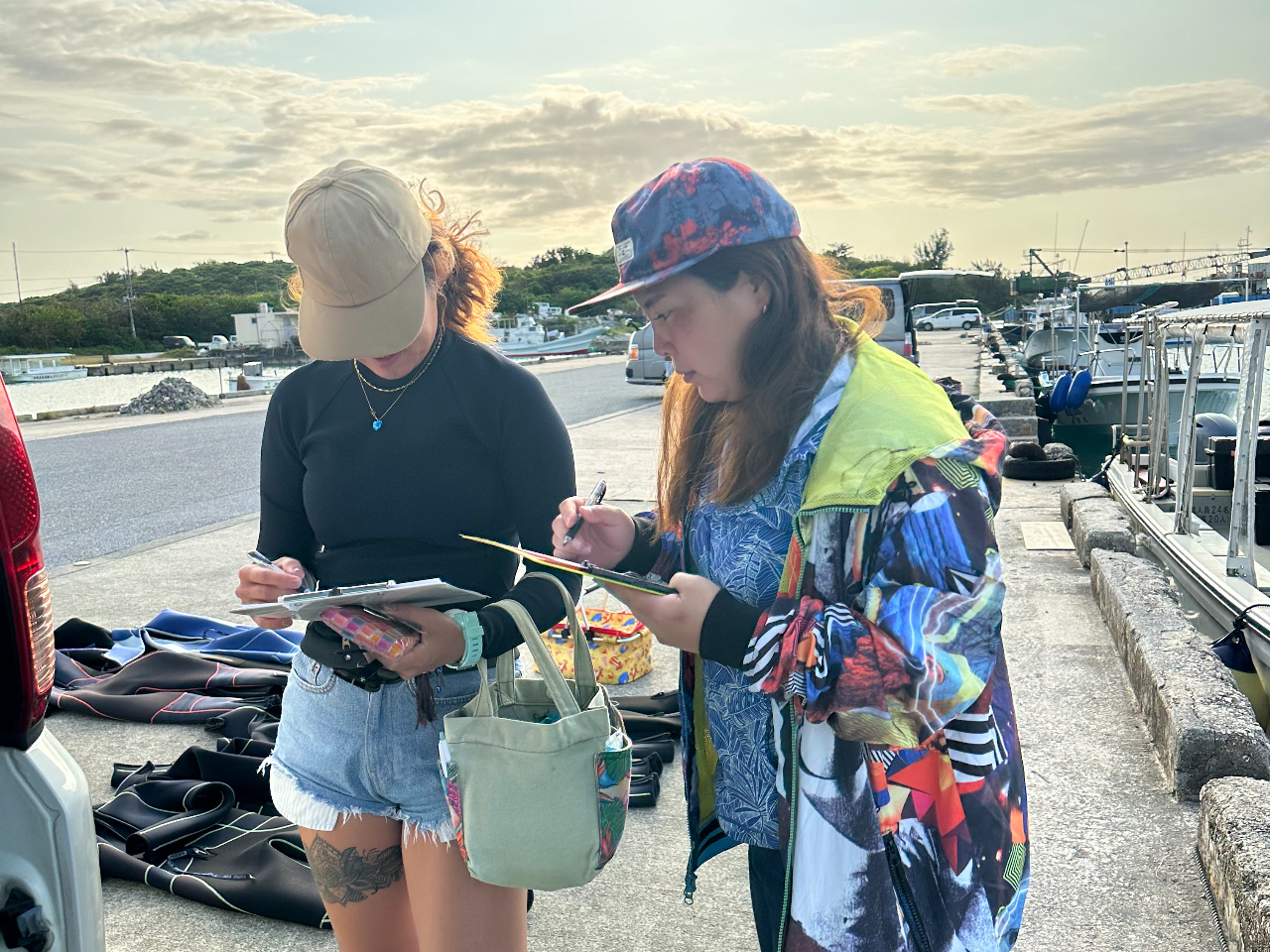 【08時40分】池間島集合。参加シートを記入。器材のサイズ合わせ、注意事項の説明。
