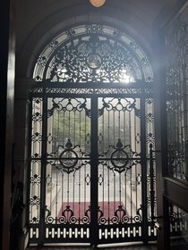 普段は開いた状態で皆様をお迎えしている鉄門にも、実は村井家の家紋である「丸に三柏」の意匠が。