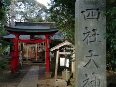 京成線のユーカリが丘駅周辺は史跡や寺社が点在しており散策に最適です。ユーカリが丘駅から徒歩で30分程の四社大神に参りました。北口のみずほ銀行のある交差点を右に進みます。途中国道296号に出る手前のY字路を左に行き296号を横切り住宅街を小竹幼稚園の方に進むとやや広い道に出て佐倉市コミュニティバスのユーカリが丘一丁目のバス停があります。バス停向いの田舎道を進むと10分程で着きます。四社大神と刻された立派な石柱があり赤い鳥居の奥に社殿が鎮座しています。境内は鬱蒼とした樹々に覆われていて静寂そのものです。案内板によると境内の樹々は樹齢二百年のアカガシ、スダジイ、タブで創建年代は不詳とありますが村の鎮守の森のお社という雰囲気です。木洩れ日の中、社殿前の迫力ある一対の狛犬も印象的でした。四社大神と併せて周辺の小竹城跡と小竹水神社も巡るとのどかな里山や田舎道の散策をより一層楽しめると思います。尚、道順は異なりますがユーカリが丘から女子大駅までモノレールを利用すると徒歩15分程で歩く距離は短縮されます。又、本数が限られますがユーカリが丘駅前からユーカリが丘一丁目まで佐倉市コミュニティバスの志津北側ルートを利用すると交通量の多い296号を歩くことがないので安心です。