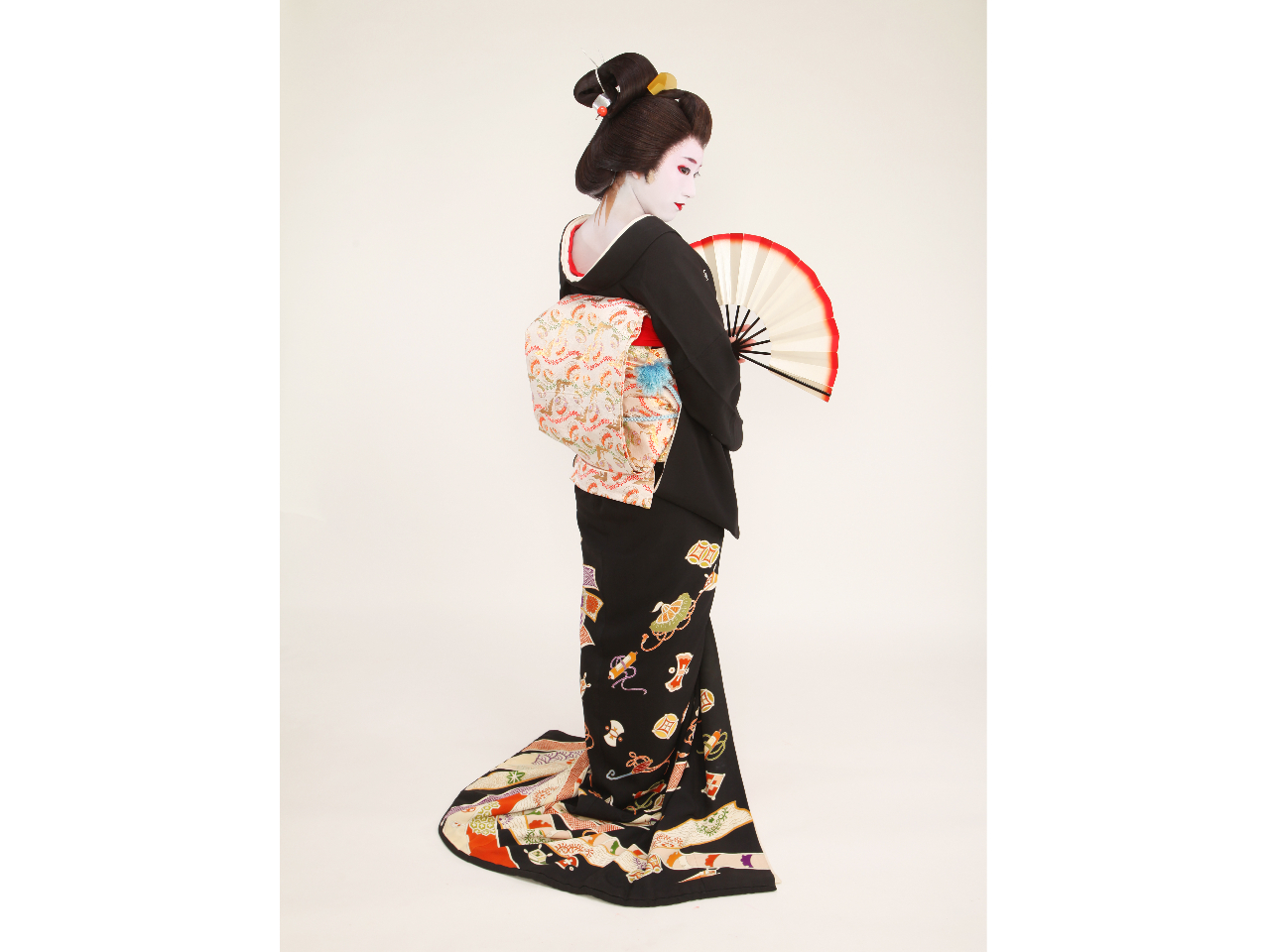 しっとりとした紺や紫、黒紋付きの着物に壮麗な帯で粋な装い。メイクは舞妓より一層華やかに、凛とした大人の美しさです。