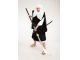 源義経の幼少名である牛若丸。水干姿で愛らしく、勇ましく。躍動感のあるポーズで撮影!衣裳の色も華やかに、源家の家紋である笹竜胆が箔置きされた衣裳です。
