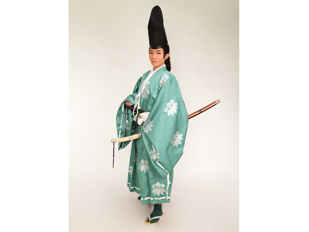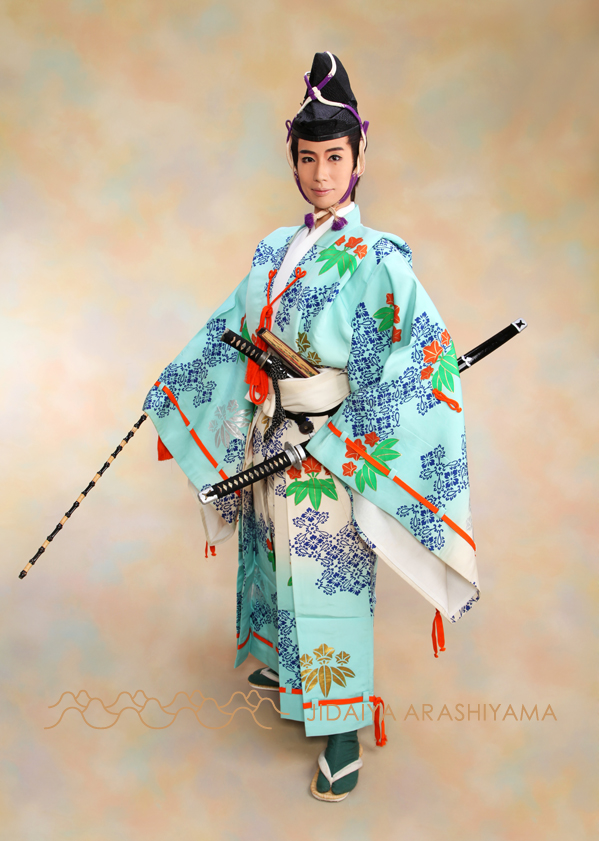 源義経の幼少名である牛若丸。水干姿で愛らしく、勇ましく。躍動感のあるポーズで撮影!衣裳の色も華やかに、源家の家紋である笹竜胆が箔置きされた衣裳です。