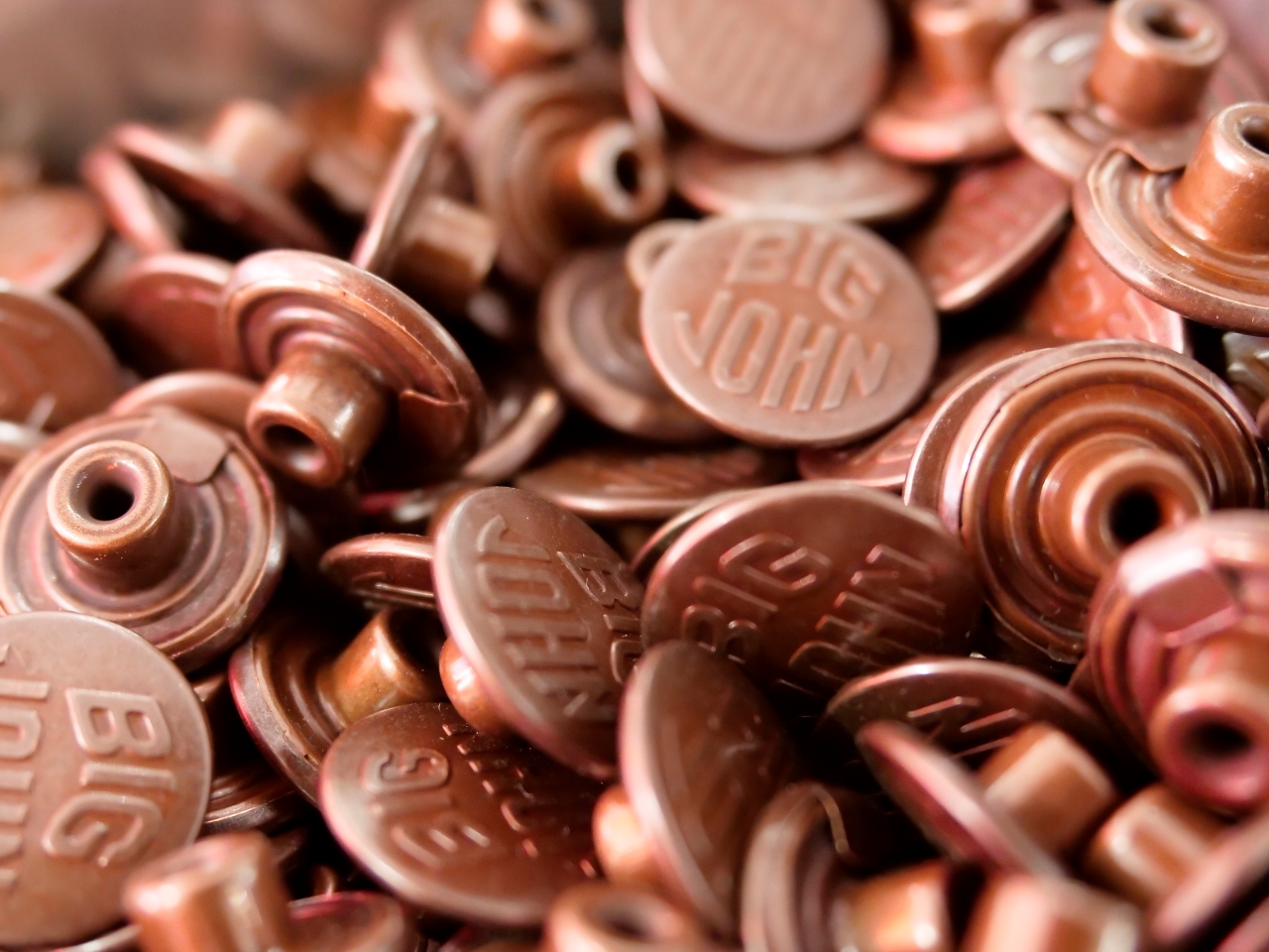 まずはスタッフさんとジーンズ選び、丈詰め採寸、ラベル選びのあと、職人さんに縫製を任せ、その間に自分で付けるボタン、リベット(6個)を選んでおきます。