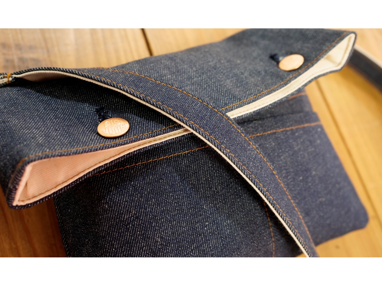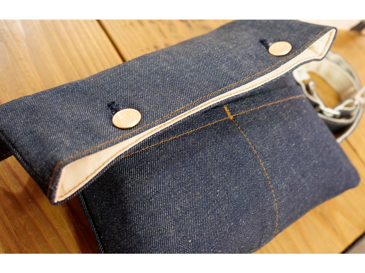 ▼デニムのウエストバックにお好きなボタン・リベットをうち込み