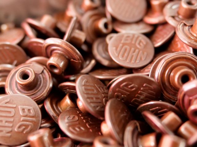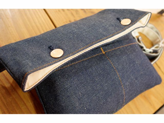 デニムのウエストバック(半製品)にお好きなボタン・リベットのうち込み体験ができます。