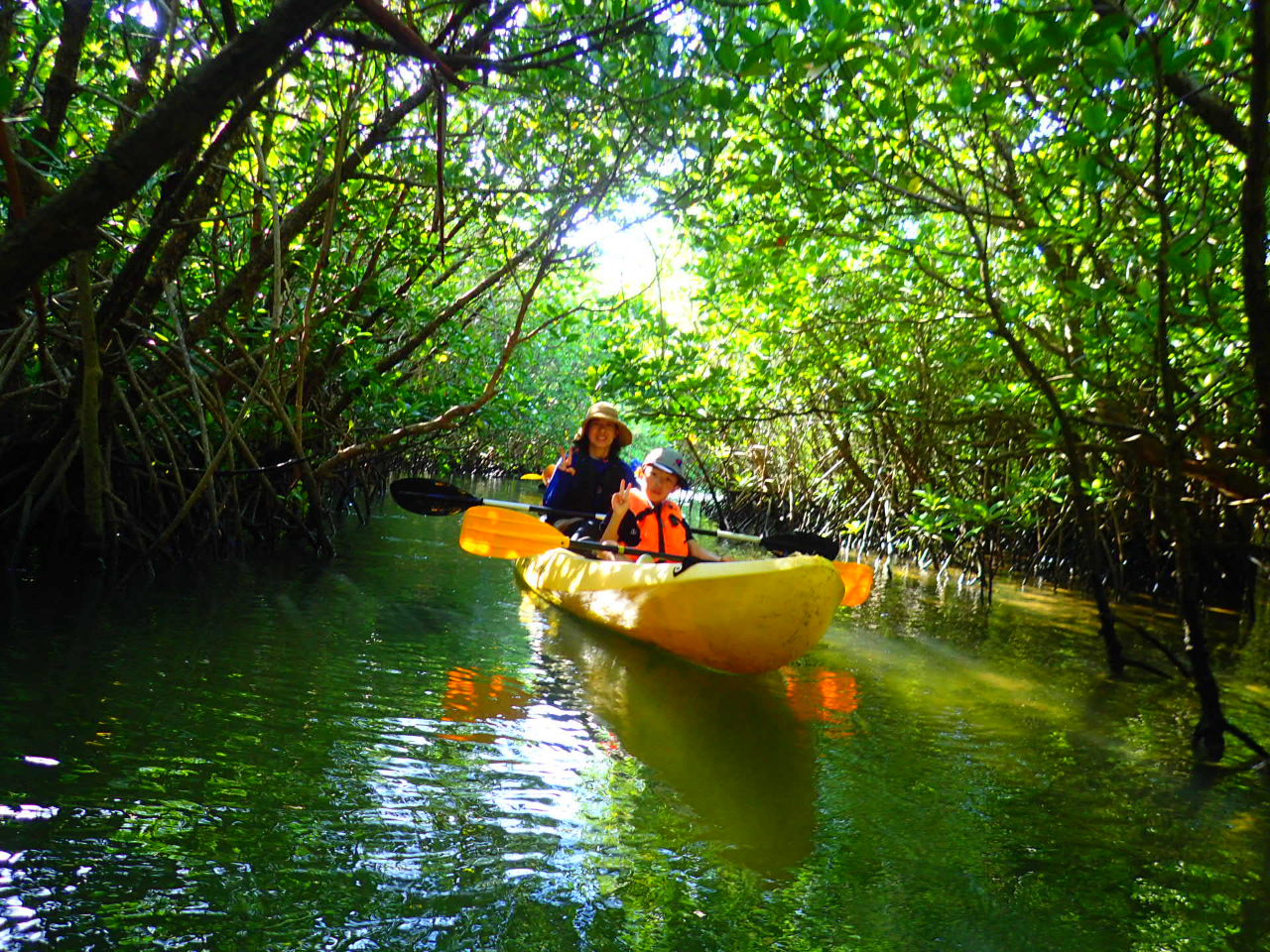 カヤックに乗って、天然記念物に指定されているマングローブの川をジャングル探検!干潟散策では生き物を間近で見られたり、マングローブの森の中を歩いたりできます。4才以上のお子様からご年配の方まで参加OK!