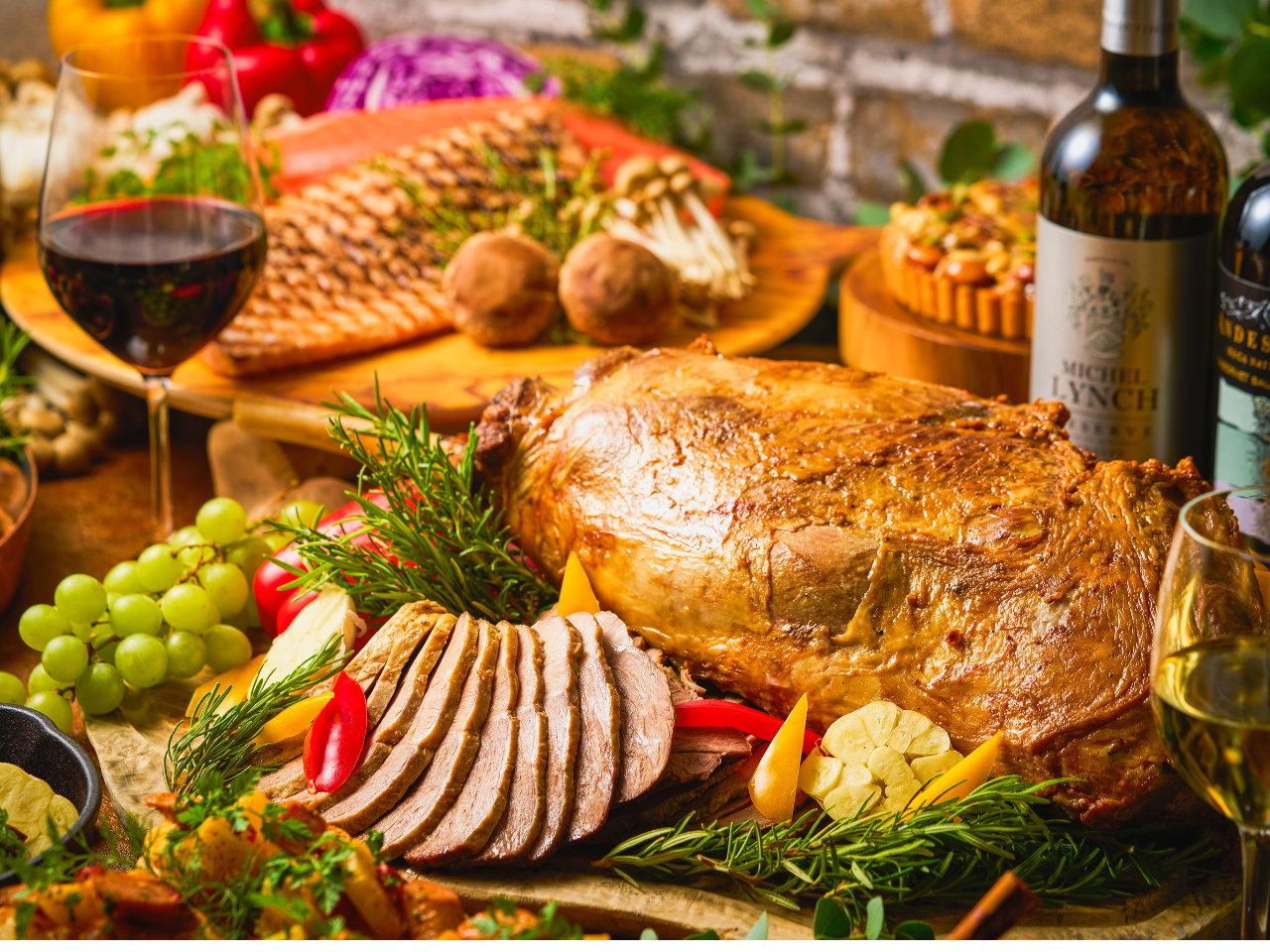 世界のホリデーメニューが並ぶ豪快で贅沢なクリスマスブッフェ。ローストターキーやハニーグレイズハム、和牛ローストビーフ、ラムレッグなどが香りと迫力で“食べる歓び”を呼び起こします。
