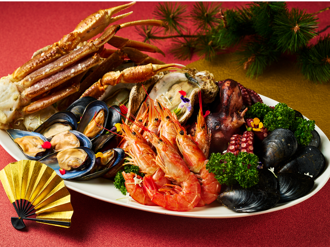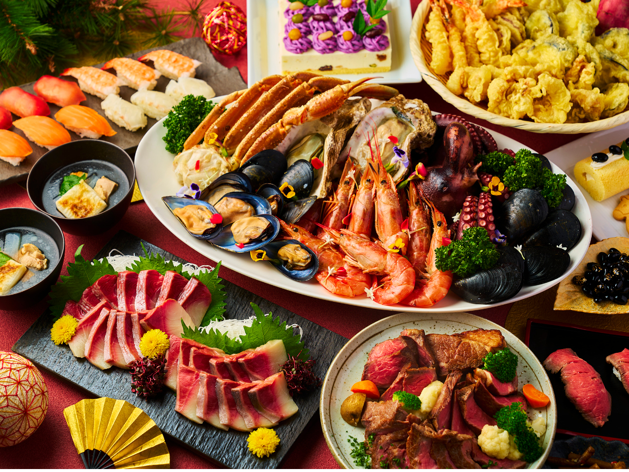 伝統のおせち料理をはじめ、新鮮なお刺身盛り合わせ、和牛あぶり寿司、天ぷらなど、の味覚をお楽しみください。