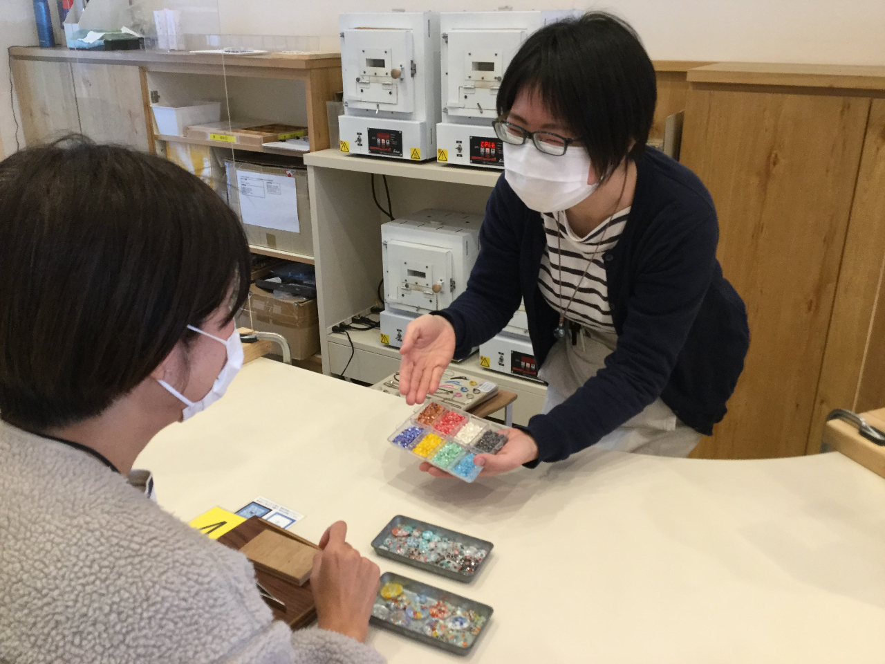 ☆「ミルフィオリ」と呼ばれる焼きあがった作品はネックレスやピアス、ヘアゴムなどのアクセサリーに仕上げます(焼き上げ、アクセサリ−仕上げはスタッフが行います)