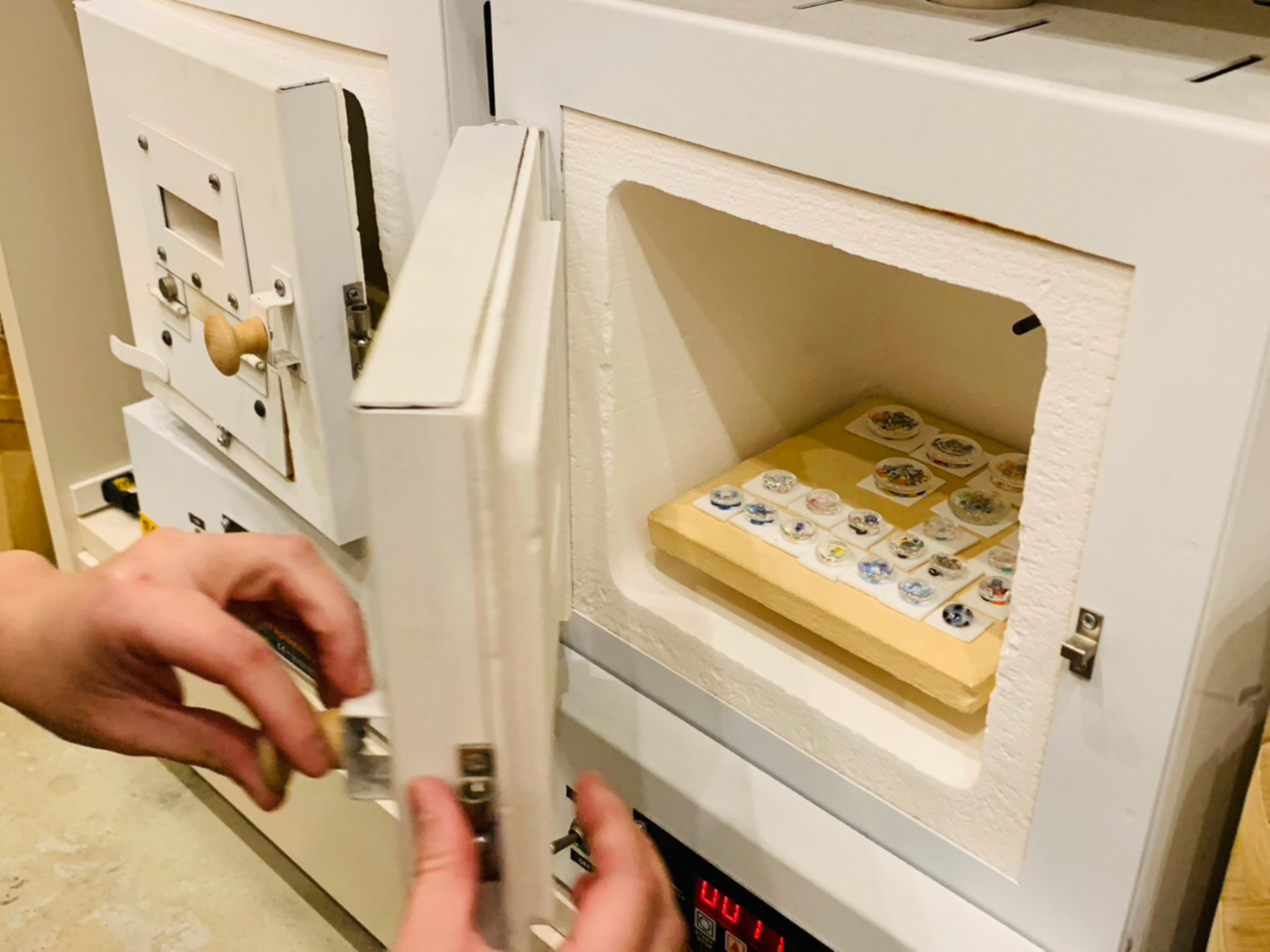お作りした作品はスタッフが電気炉で焼成致しますので完成まで約1〜2週間いただきます。