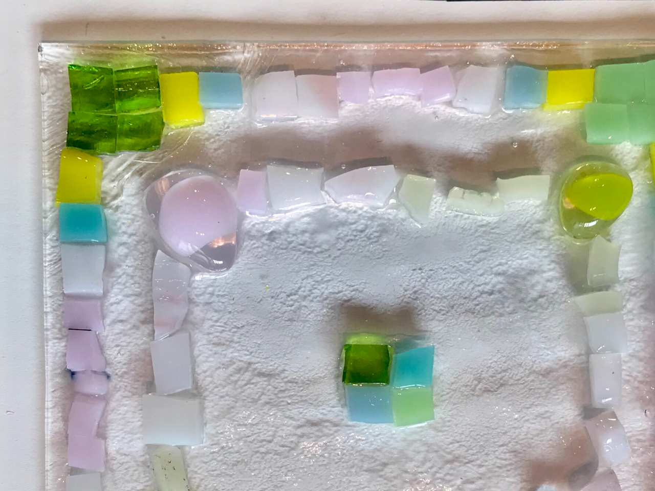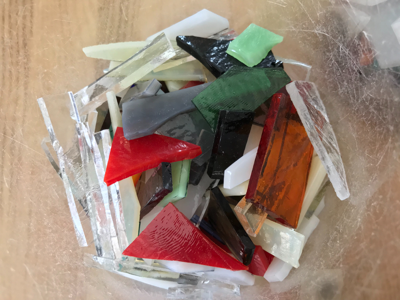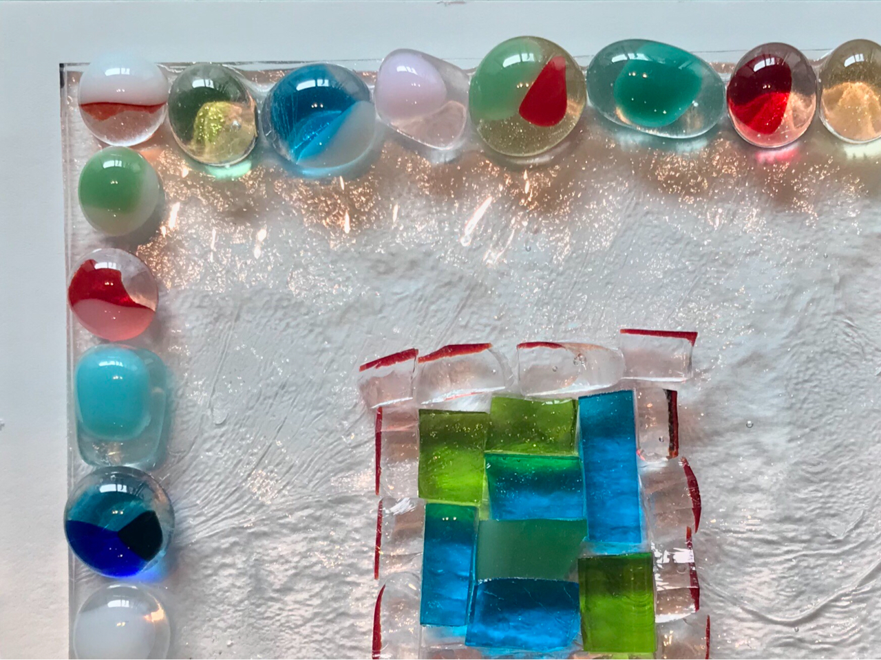 透明のクリアガラスの上にお好みの色ガラスをカットして並べていきます。