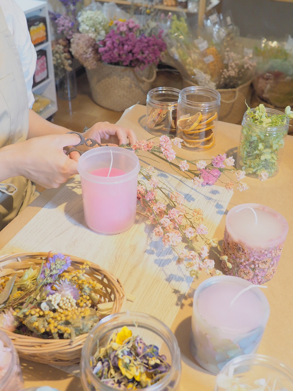 教室はたくさんの花材と色とりどりの素敵なキャンドルに囲まれたオシャレ空間!