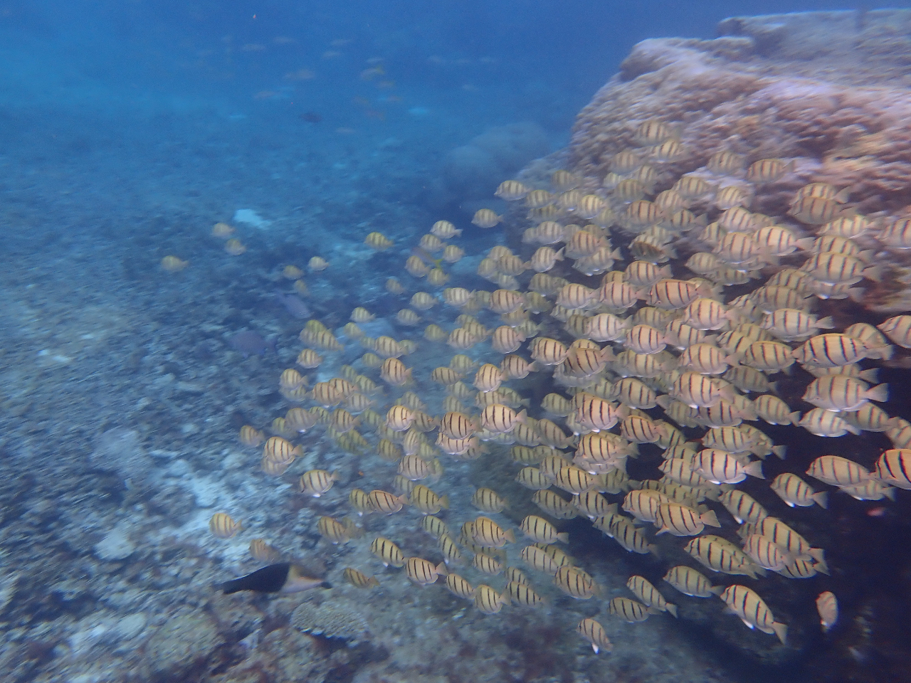 ウミガメのいるポイントにはあまり熱帯魚がいません。熱帯魚のいるサンゴ礁にはカメはいません。