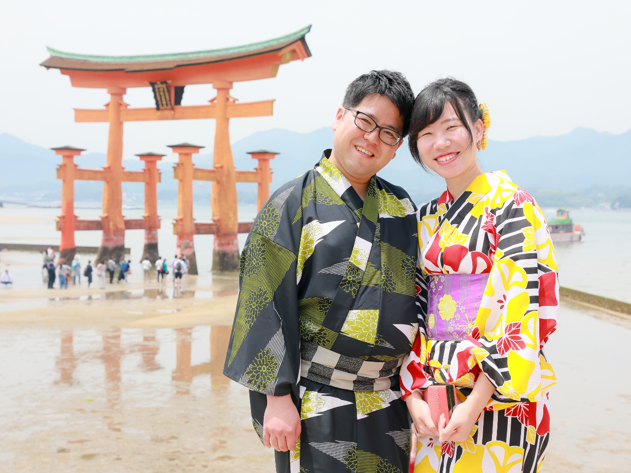 宮島デートなら【カップル着物・浴衣プラン】着物で厳島神社を観光のほか、夏は広島の浴衣祭り「とうかさん」や花火大会にもどうぞ。こっそり彼女にプレゼントもおすすめです!