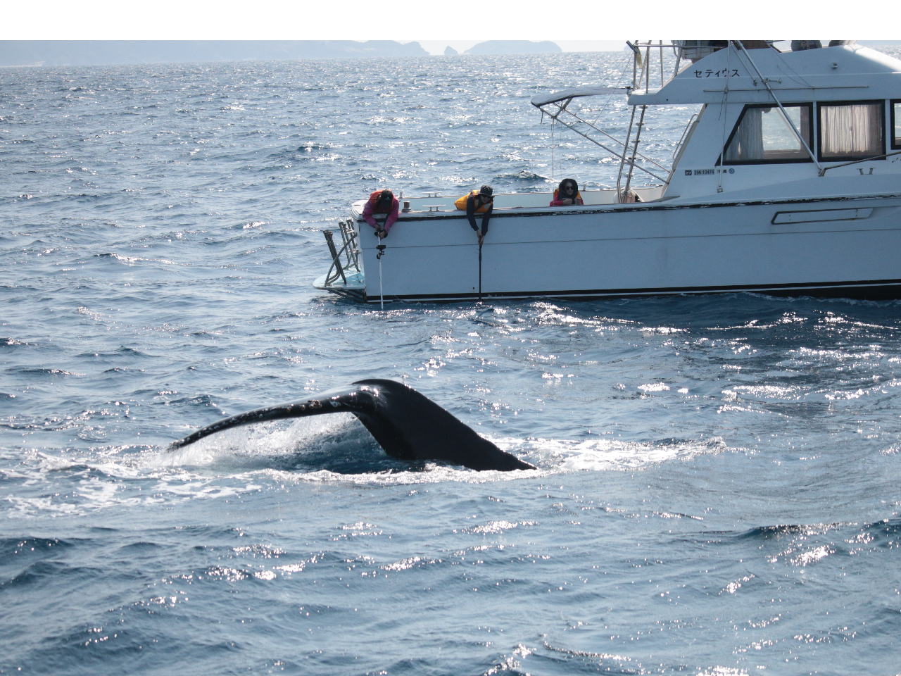 また、ボートでクジラを探すのではなく、島の展望台からクジラ誘導スタッフの指示を受けてクジラのいる場所まで直行するので2時間のツアー時間内でもウォッチング時間が1時間30分もあります。