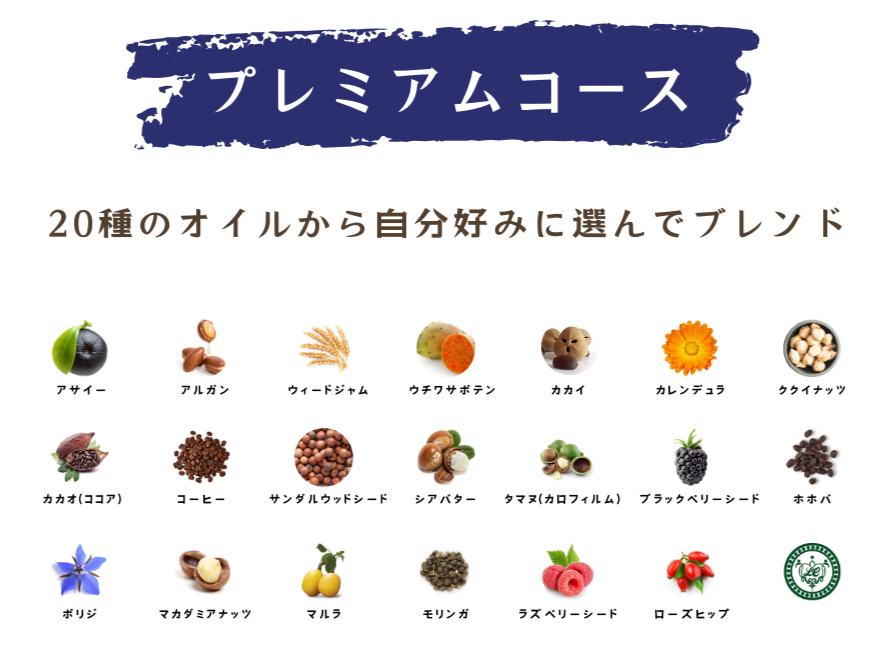 20種類のオイルの中から自分の肌タイプに合わせてオイルを選び、自分にぴったりの美容オイルを作りましょう。香り付もできます。容量は30mlです。