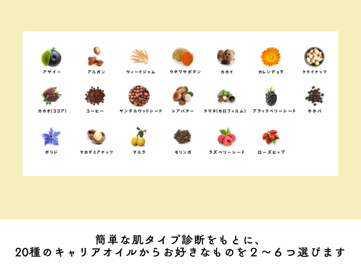 20種類のオイルの中から、効能や自分の肌タイプに合わせて2〜6種類選びます。