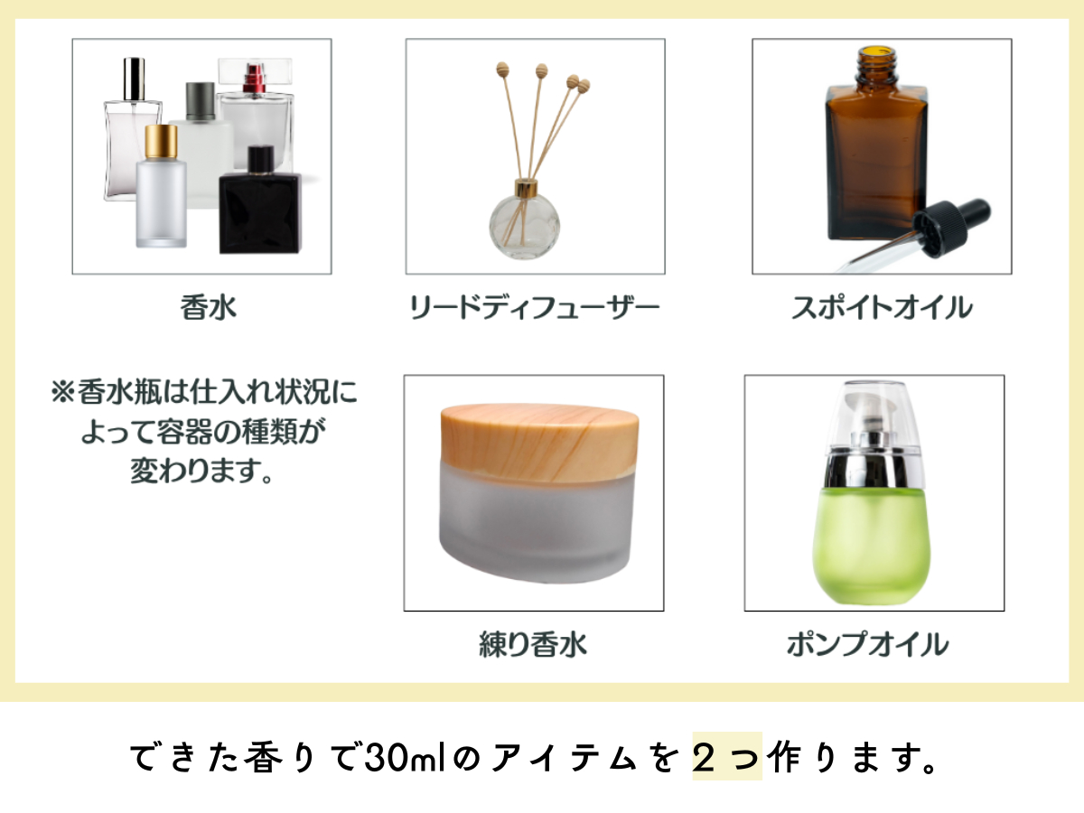 200種類の香りからオリジナルブレンド。リップクリームや香水などの小さいアイテムが1個作れるコースです。