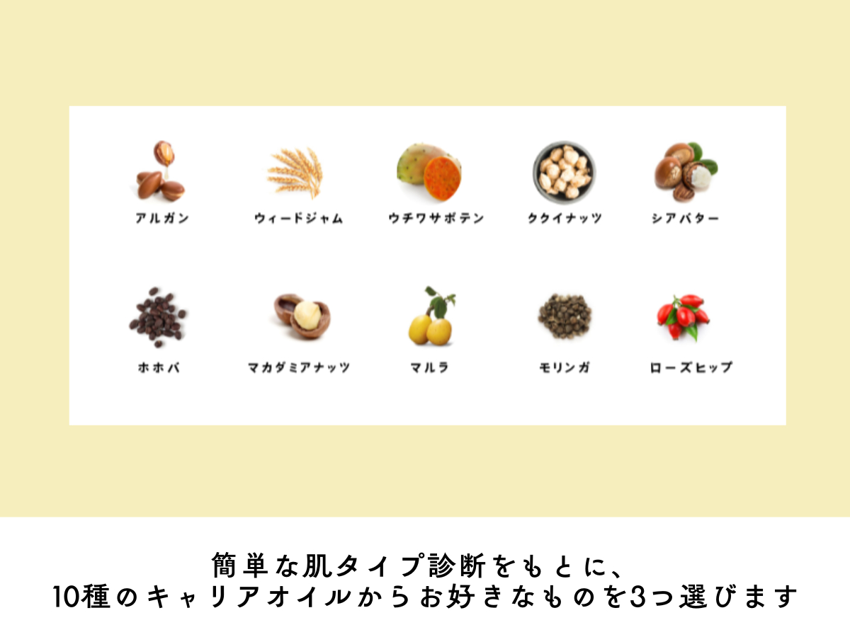 10種類のオイルの中から自分の肌タイプに合わせてオイルを選び、自分にぴったりの美容オイルを作りましょう。香り付けもできます。容量は10mlです。