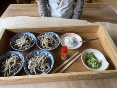 ひとり1こね分(6食分)x2名で体験。打った蕎麦を2食分ずつ茹でて、食べて帰りました。