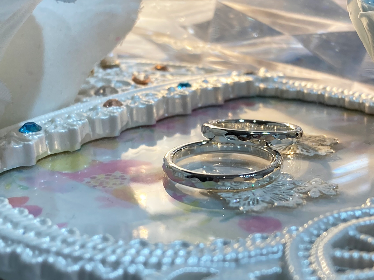 リング幅は2.5mm固定、英数字・記号・ハート、日本語などの**刻印(無料)**も当日その場でお入れできます。
