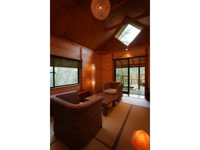 林道を通りぬけると、趣ある古民家風ラウンジ、それぞれに源泉使用の二つの露天風呂を設けた、十の個室貸切露天風呂。