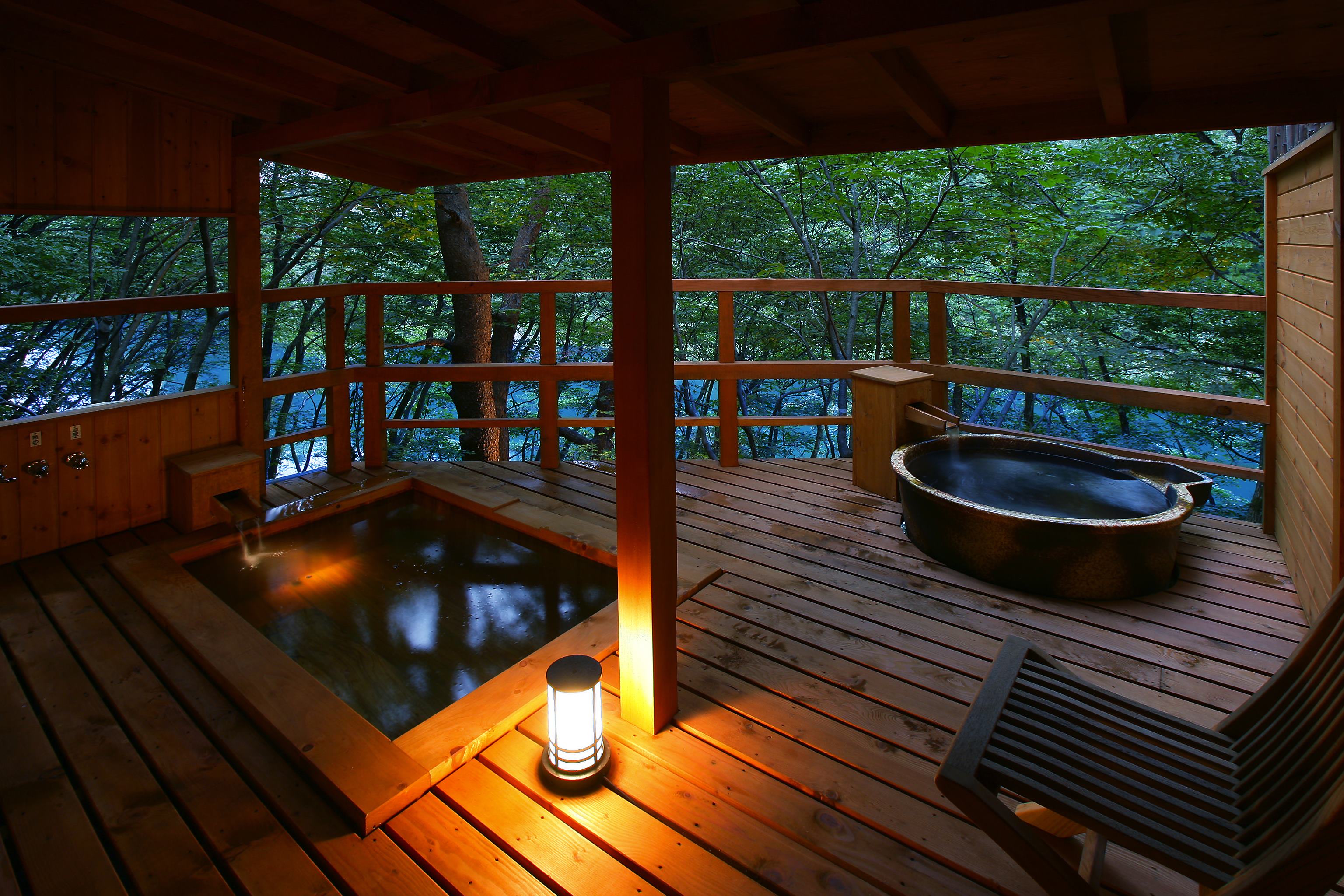 自家源泉使用の本物の湯のぬくもり、鬼怒川の四季の彩りと眺望に、心ゆくまで浸れる渓谷沿いの「離れの湯」