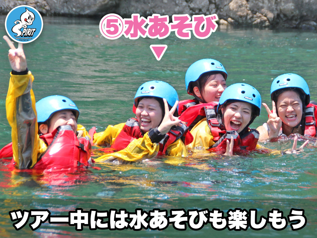 ライフジャケットをつけ、ガイドが見守っているので安心して水遊びを満喫できるよ。