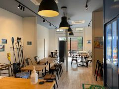 受付はカフェ併設の店内で!トイレ、シャワー、更衣室がございます。
