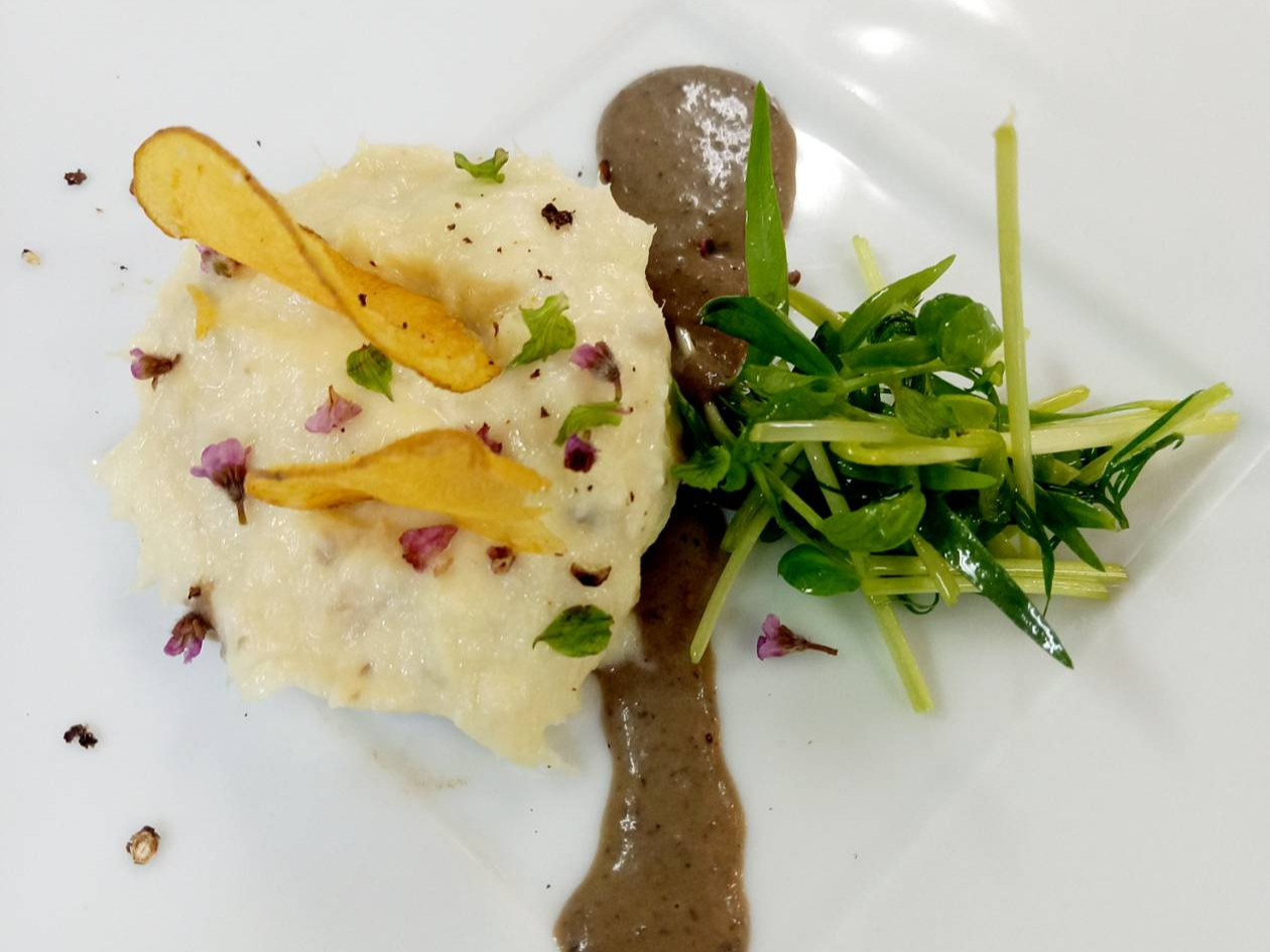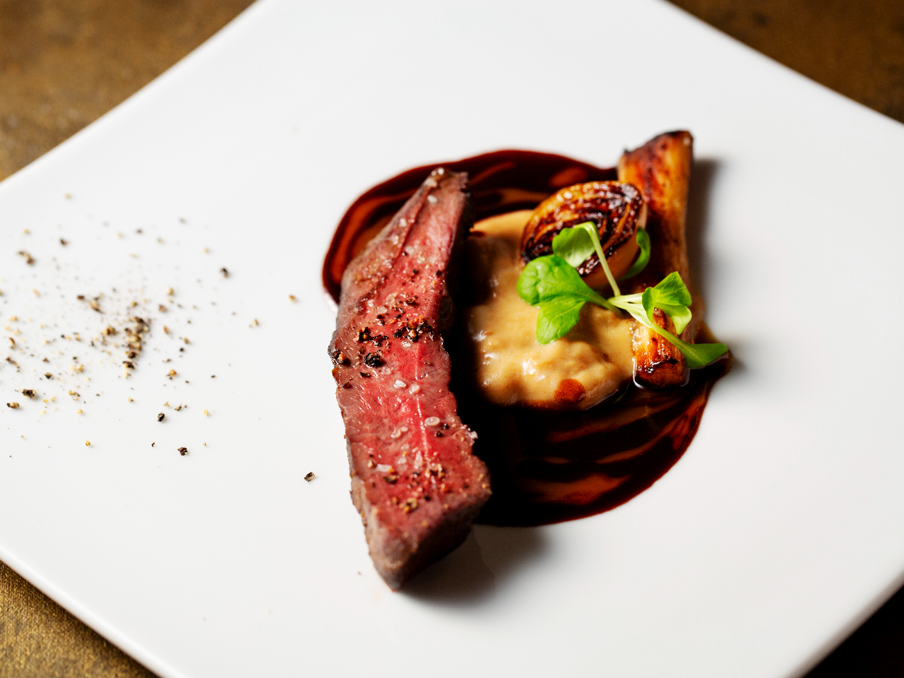 蝦夷鹿のロティ パースニップのピュレ バニュルスソース